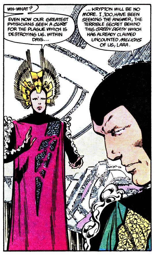 While there are some differences, there is a clear design tie between this version of both Jor-El and Lara, and the Kryptonian Council in the new film. Note the metallic spiky headress and the “Only face showing” head covering:
